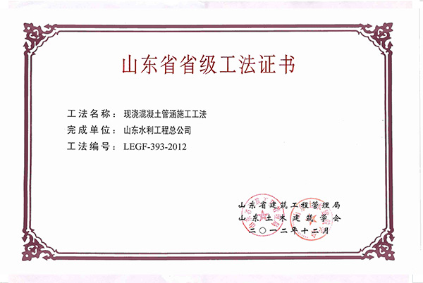 公司“現(xiàn)澆混凝土管涵施工工法”被評(píng)為2012年山東省省級(jí)工法