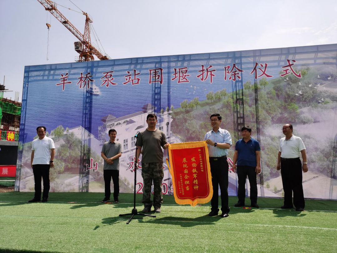 羊橋泵站閘門完全具備了啟閉功能,水泵具備了排水功能,圍堰的拆除標(biāo)志著羊橋泵站的正式啟用,為今年防汛防潮排澇提供了工程保障,對(duì)保證羊口鎮(zhèn)人民生命財(cái)產(chǎn)安全具有重要意義。儀式上,王法順部長(zhǎng)代表工程指揮部給公司授予了錦旗,表達(dá)了對(duì)公司領(lǐng)導(dǎo)及參建職工的感謝,贊揚(yáng)了水總?cè)俗詮?qiáng)不息、勇于超越的鐵軍精神。