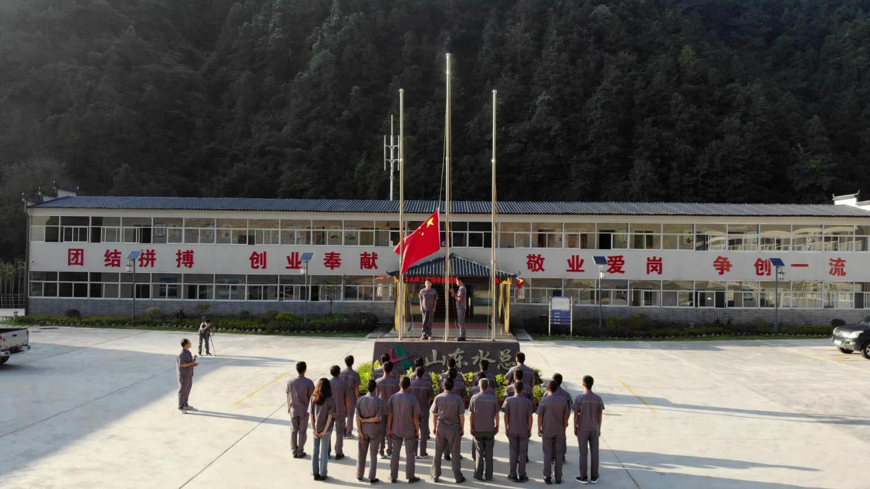7點(diǎn)30分,國(guó)歌響起。駐項(xiàng)目全體員工,肅然而立,伴隨著雄壯激昂的國(guó)歌,向冉冉升起的五星紅旗行注目禮。仰視著五星紅旗飄揚(yáng)在旗桿頂端,大家共同吶喊:山東水總有限公司第六分公司祝祖國(guó)繁榮昌盛、國(guó)泰民安。