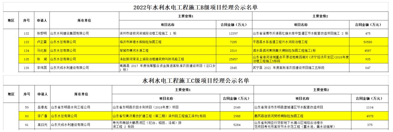 近日,中國水利企業(yè)協(xié)會(huì)發(fā)布《2022年水利水電工程施工項(xiàng)目經(jīng)理評(píng)價(jià)等級(jí)公示》,我公司盧正雷、馬化振、張斌三名同志被評(píng)為“2022年水利水電工程施工B級(jí)項(xiàng)目經(jīng)理”,李廣喜被評(píng)為“2022年水利水電工程施工C級(jí)項(xiàng)目經(jīng)理”。