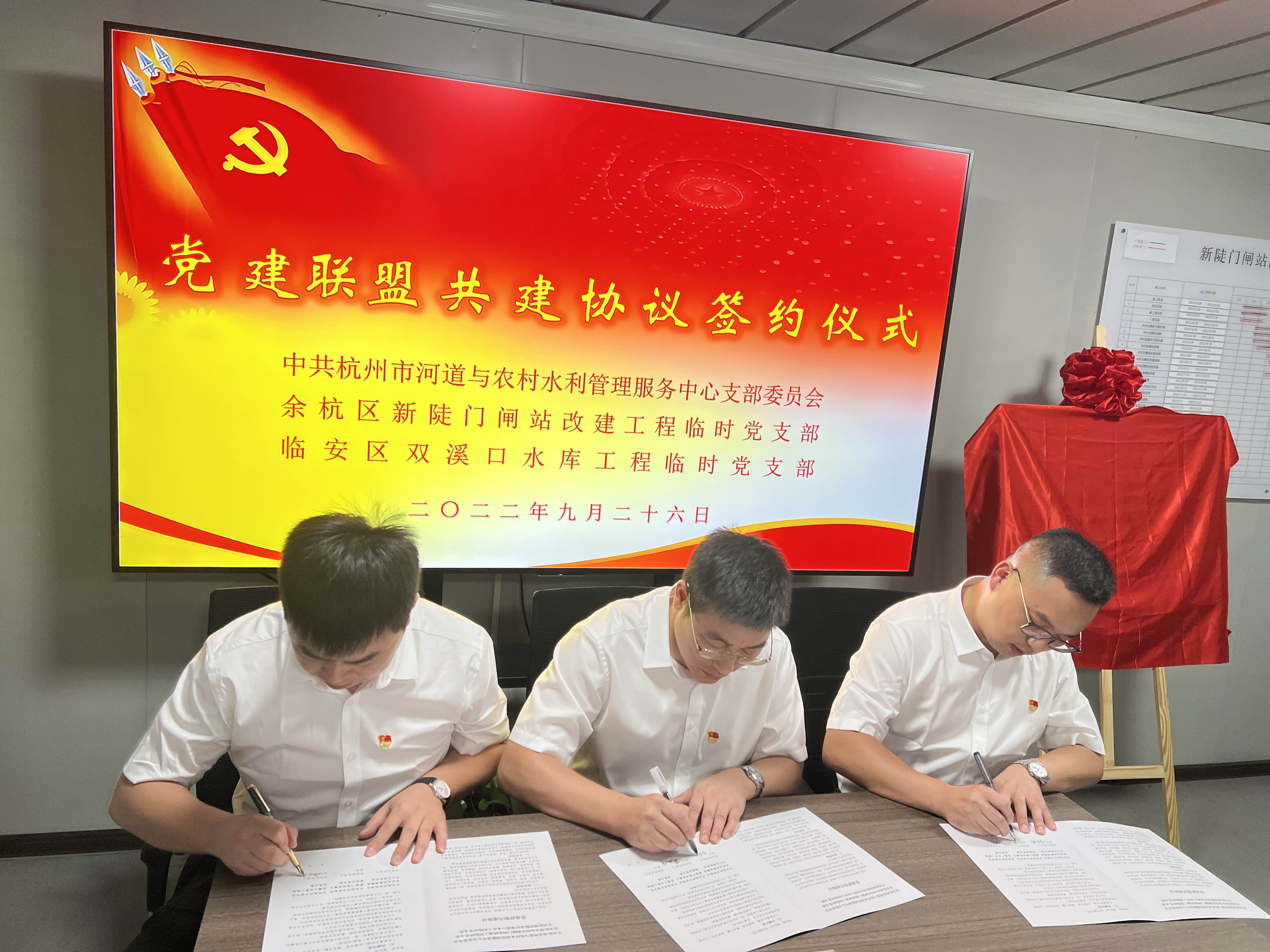 9月26日,中共杭州市河道與農(nóng)村水利管理服務(wù)中心支部委員會(huì)、中共杭州市余杭區(qū)新陡門(mén)閘站改建工程臨時(shí)黨支部、中共杭州市臨安區(qū)雙溪口水庫(kù)工程臨時(shí)黨支部在新陡門(mén)閘站改建工程現(xiàn)場(chǎng)舉行黨建聯(lián)建協(xié)議簽約儀式。市農(nóng)水中心支部書(shū)記、主任葉利偉,余杭區(qū)林水局黨委委員、二級(jí)調(diào)研員徐偉林,臨安水利局機(jī)關(guān)黨委副書(shū)記、紀(jì)檢書(shū)記劉勇,新陡門(mén)閘站改建工程臨時(shí)黨支部書(shū)記葛旭峰,雙溪口水庫(kù)工程臨時(shí)黨支部書(shū)記孟天琦及各支部代表參加簽約活動(dòng)。