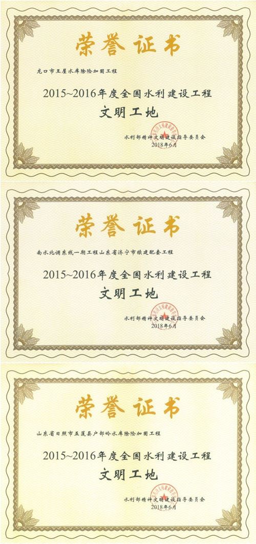 公司“龍口市王屋水庫(kù)除險(xiǎn)加固工程”等項(xiàng)目榮獲“2015-2016年度全國(guó)水利建設(shè)工程文明工地”稱號(hào)